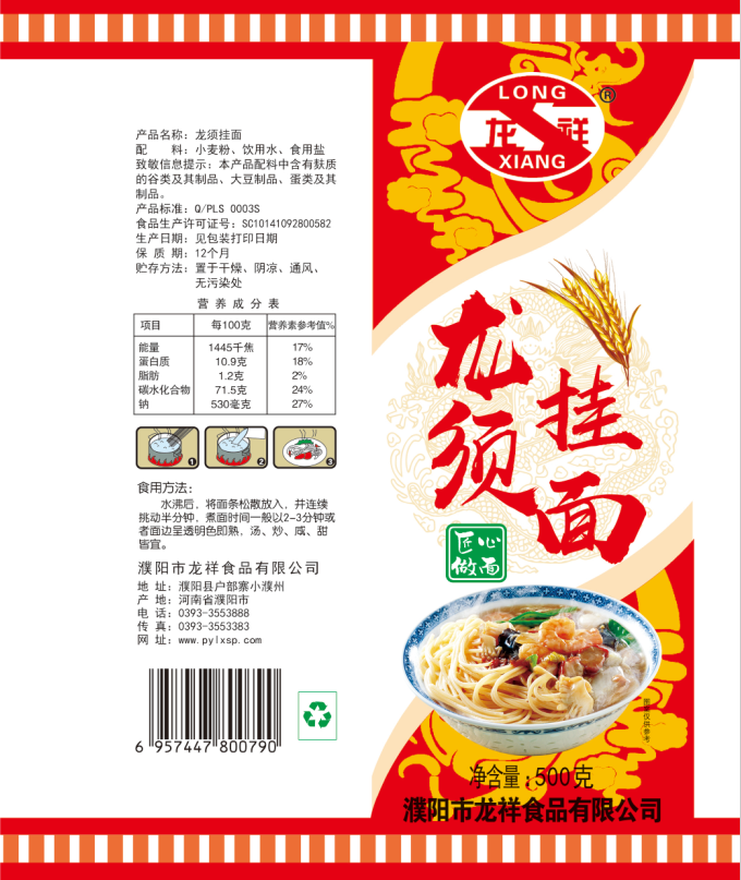 濮陽(yáng)市龍祥食品有限公司位于河南省濮陽(yáng)縣戶部寨鎮(zhèn)小濮州,始建于1994年,前期投資200萬(wàn)元,經(jīng)過幾年的努力,大力開發(fā)市場(chǎng),由于市場(chǎng)的需求量急劇上升,出現(xiàn)供不應(yīng)求,于2004年擴(kuò)建,建成一座新型的現(xiàn)代化面粉加工企業(yè),并擁有全國(guó)先進(jìn)全自動(dòng)生產(chǎn)設(shè)備一套,產(chǎn)量由以前的100噸/天,提高到現(xiàn)在400噸/天。 2012年再次擴(kuò)大規(guī)模申請(qǐng)為濮陽(yáng)市龍祥食品有限公司,注冊(cè)資金500萬(wàn)元。2012年又投資800萬(wàn)元新建掛面生產(chǎn)線一條,日產(chǎn)掛面50噸。龍祥食品有限公司現(xiàn)有職工120余人,總工程師1人,專業(yè)技術(shù)人員10人,經(jīng)濟(jì)師1人,會(huì)計(jì)師1人,銷售人員2人,優(yōu)秀專業(yè)人員20余人。  龍祥公司自創(chuàng)建以來(lái),社會(huì)效益十分可觀。公司一直以“今天的質(zhì)量,明天的市場(chǎng)”為信念,“一切為了客戶需求,竭誠(chéng)追求完美品質(zhì)”為企業(yè)宗旨,走專業(yè)化經(jīng)營(yíng)和職業(yè)化管理的路子。